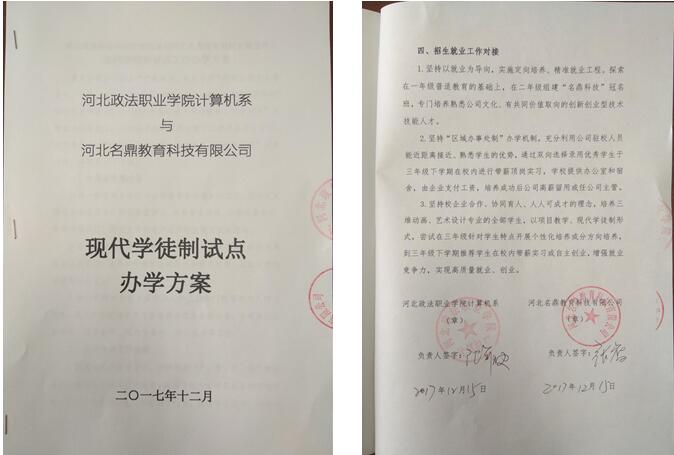 为贯彻落实党的十九大“产教融合、校企合作”的职教方针,进一步提高学院人才培养质量,计算机系针对数字媒体应用技术(三维动画设计方向)和艺术设计(视觉传达方向)两个专业,与河北铭鼎教育科技有限公司在“定向培养、精准就业”框架协议的基础上,合作编制“现代学徒制”试点工作办学方案,明确责任与义务,在我院设公司驻校办事处,实现中高层管理对接、人才培养工作对接、创新创业对接和招生就业对接。