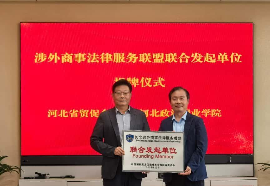 9月23日,我校举行涉外商事法律服务联盟联合发起单位揭牌仪式,并围绕相关议题开展专题研讨。联盟牵头单位河北省贸促会法律部部长孙保国一行三人来校交流,与校党委委员、副院长冯兆蕙共同为联合发起单位揭牌。