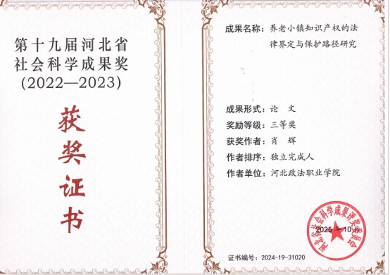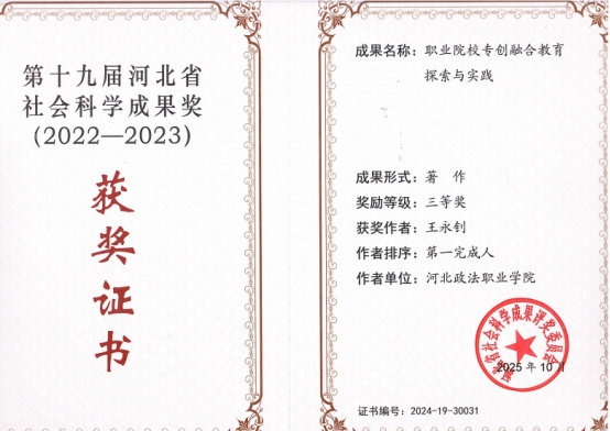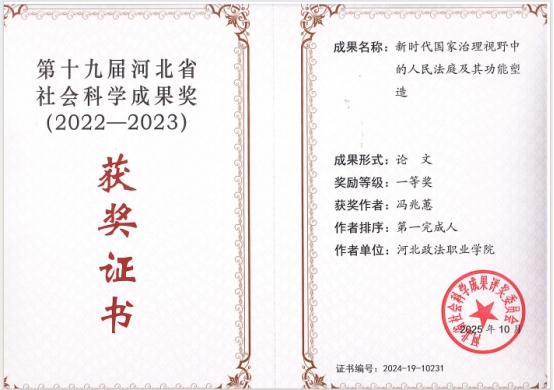 近日,第十九届河北省社会科学成果奖评选结果正式公布。我校冯兆蕙教授的论文《新时代国家治理视野中的人民法庭及其功能塑造》荣获一等奖,王永钊教授的著作《职业院校专创融合教育探索与实践》荣获三等奖,肖辉教授的论文《养老小镇知识产权的法律界定与保护路径研究》荣获三等奖。