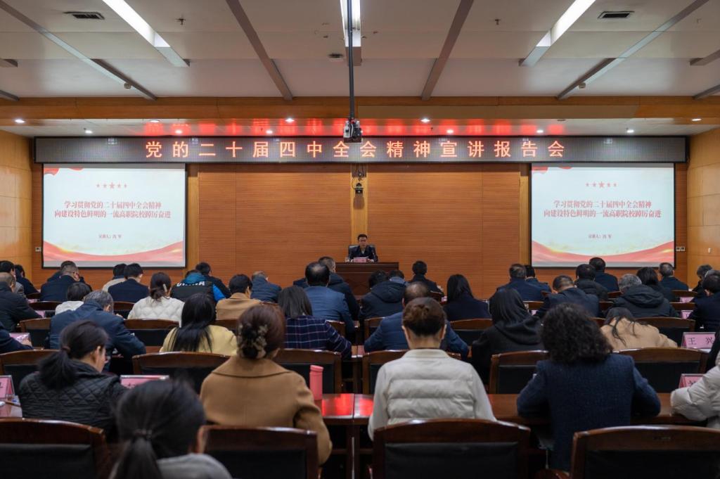 11月21日,学校在友谊校区(校本部)学术报告厅召开党的二十届四中全会精神宣讲报告会。校党委书记冯军以“学习贯彻党的二十届四中全会精神 向建设特色鲜明的一流高职院校目标踔厉奋进”为题,面向中层以上领导干部、年轻后备干部、师生代表和民主党派成员宣讲全会精神。