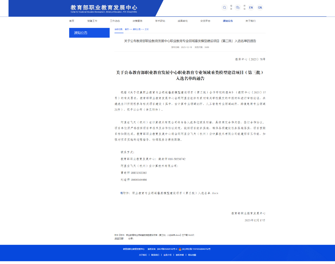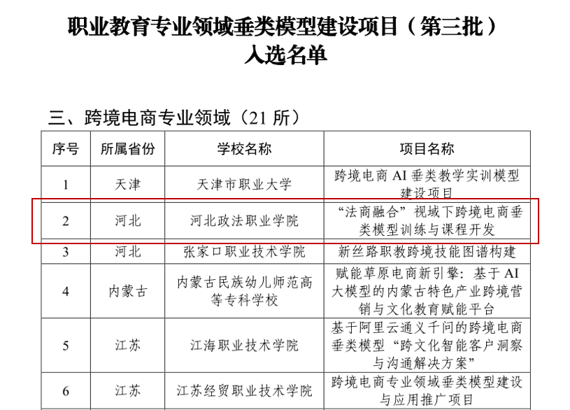 近日,教育部职业教育发展中心公布了职业教育专业领域垂类模型建设项目(第三批)入选名单,我校“‘法商融合’视域下跨境电商垂类模型训练与课程开发”项目成功入选跨境电商专业领域项目,成为全国77所入选院校中跨境电商专业领域21所优质院校之一。