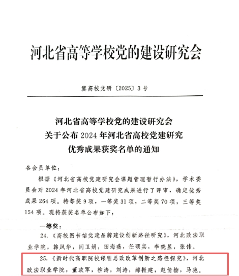 司法实务系《新时代高职院校课程思政改革创新之路径探究》荣获河北省高等学校党的建设研究会优秀成果一等奖。