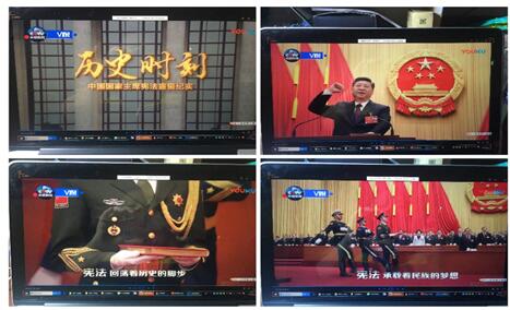 课堂上为了能与学生密切互动和交流,我采用QQ群分享屏幕进行直播,期间与职教云平台交叉完成活动项目。讲述宪法的基本原理时,我精心节选了电影《我和我的祖国》中1997年香港回归中方在7月1日0点0分升起中华人民共和国国旗的故事。当国歌响起,我们的国旗手在香港交接仪式上升起国旗的那一刻,学生与我在心中激荡的就是我爱我的祖国。当观看2018年3月17日在全国人民代表大会第十三届一次会议上习近平同志再次当选为国家主席,向宪法宣誓的纪实记录时,礼兵护送着宪法走到主席台,主席左手放在《中华人民共和国宪法》上,我们对宪法产生了无比崇敬之情。