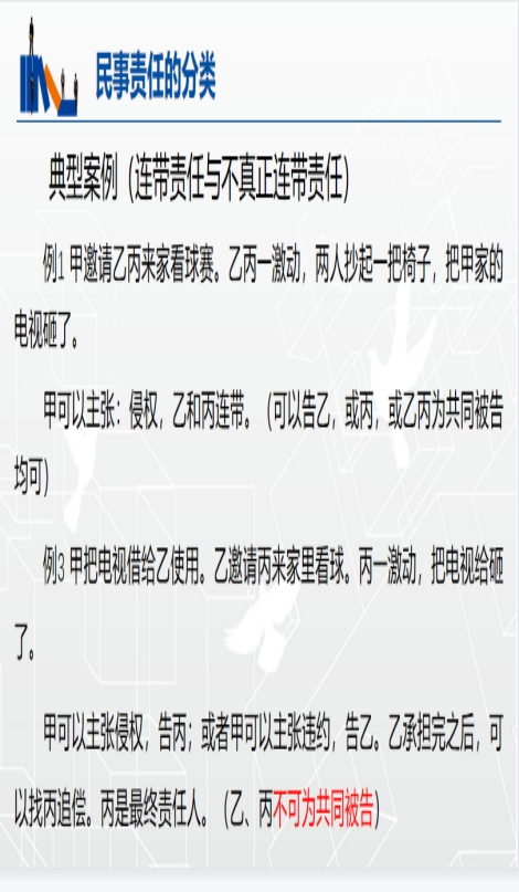 职教云中发布课前通知,让学生观看相关教学资源。课中直播授课,针对重难点,选用启发性经典案例,如在讲授民事法律责任中连带责任和不真正连带责任时,选取贴近日常生活的两种常见情形,通过对具体的案例的分析、讨论让学生归纳出两种责任的区别,渗透民事诉讼法中共同被告和第三人的相关知识,使得实体法与程序法融会贯通。再在职教云课中发布已经设计好的类似案例或习题检验学生的掌握程度,学生在轻松的氛围中掌握知识与技能。课后发布相关测验。