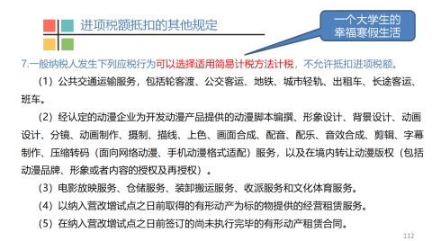 本课程涉及常见税种的法律条文,在讲授中,尽量让学生学得轻松。比如,讲到知识点“一般纳税人发生下列应税行为,可以选择适用简易计税方法计税,不允许抵扣进项税额”,编一个“一个大学生幸福的寒假生活”的小故事,将知识点中的应税行为串起来。