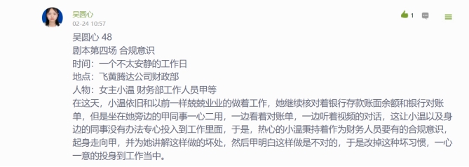 将课程思政点编写成大学生刚刚步入社会的四集小剧本,课上讲三集,第四集让学生续写,同学们积极响应,有的剧本非常棒。