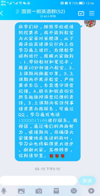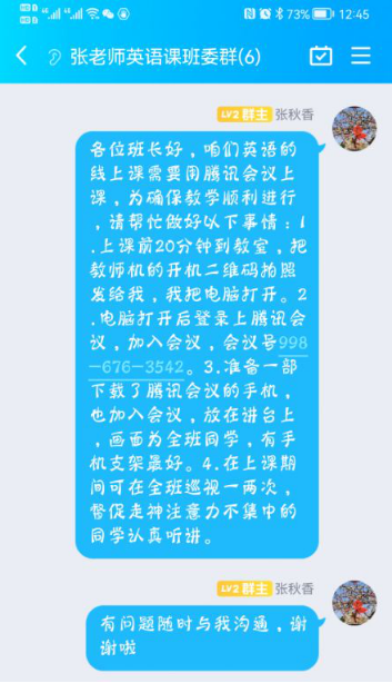 4.充分发挥班内班委的作用。班委在线上教学过程中积极配合,充分发挥了积极带头作用。比如上午第一节课的班委在7点30分左右就到了教室,打开教师机,登录腾讯会议,协助老师做好线上教学的课前准备。