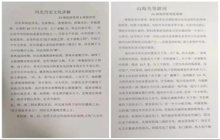 开学之初已通过QQ直播课堂给同学们布置了任务,每周编写河北省各地市著名景区导游词一篇,共计12篇,篇幅2000--2500字,并要求同学们熟练背诵;整理六个关于河北省的专题演讲资料,即河北历史文化、河北长城文化、河北红色文化、河北自然风光、河北风物特产、河北饮食文化。通过这两方面的写作,帮助同学们树立热爱祖国大好河山和灿烂文化的情怀。