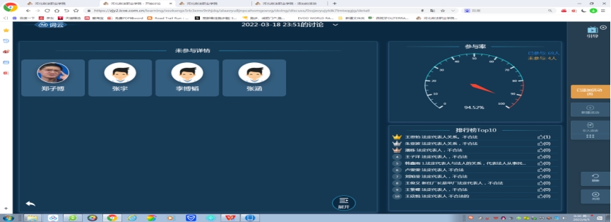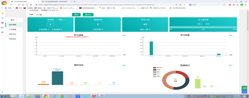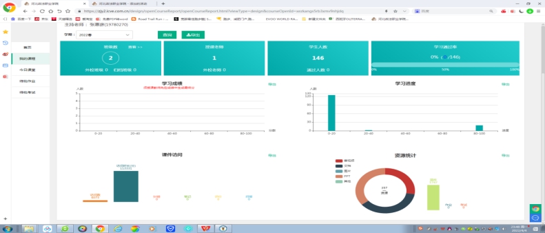 有了腾讯课堂的直观监测,还需要有充足的教学资料,这个学期我教的课程是《民法》《国际经济法》,《民法》课程在职教云平台提供了357个资源,《国际经济法》课程在职教云平台提供了120个资源,有视频、PPT、题库等,能够满足课堂教学、讨论、测试的需要,同时也为课后复习、整理笔记提供了资料,学生可以反复看视频,弥补了学生课堂学习的不足。课件访问时长,《国际经济法》达到了9864小时,《民法》达到了113331小时,有效的保证了教学效果。