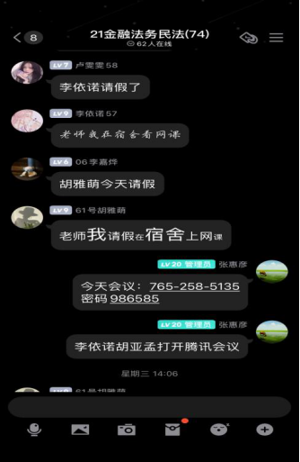 与之前的网课不同,我这次采取了腾讯课堂的授课方式,系里配备了摄像头,这样在上课时能实时看到学生的上课状态,因此,在签到环节采取了二维码签到,二维码不断更新,杜绝了学生不在教室而签到的情况,保证了学生的出勤率。对于由于手机原因不能签到的同学,在他们提交了在教室的照片后,也可以给予更改。对于个别因病请假在宿舍的同学,也会督促他们要坚持在宿舍上网课,争取让学生少丢课。