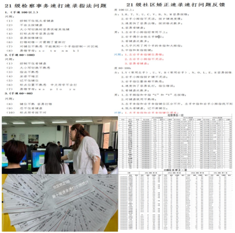 每节课系统讲解后布置相应练习任务,个别辅导练习,规范打法,纠正学生们出现的问题,从而精准的提供解决措施,提升学生们的打字速度。每节课给学生发放作业纸,记录速录时长,手速,问题反馈,课后汇总数据,形成速录手速表格数据表,准确监控到所有学生的按键记录、手速数据。