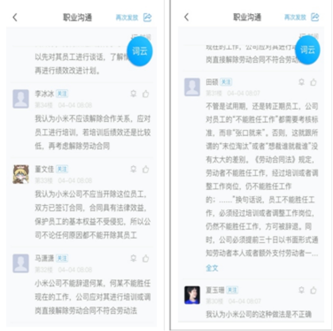 再比如针对微博热搜“小米辞退不能胜任员工终审败诉”,我让学生在学习通上讨论后,主动进行3分钟观点阐述。董文佳同学认为,小米公司不应当开除这位员工,双方已签订合同,合同具有法律效益,保护员工的接本权益不受侵犯,所以公司不论任何原因都不能开除其员工。田硕同学精准到《劳动合同法》的第四十条规定:劳动者不能胜任工作,经过培训或者调整工作岗位,仍不能胜任工作的,方可辞退。并且强调,公司必须提前三十日以书面形式通知劳动者本人或者额外支付劳动者一个月工资后,可以解除劳动合同。说“热点”,既条理清楚,又有根有据。通过这个热点,培育学生的法治思维。