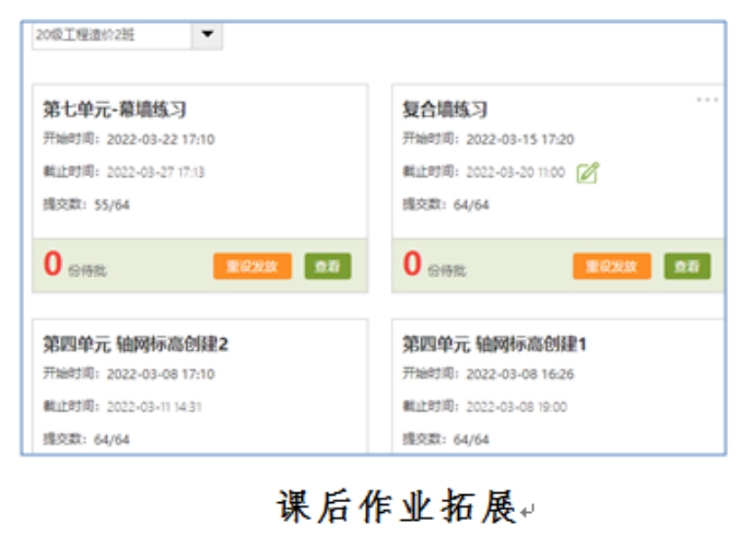 首先课前10分钟会通过超星学习通的签到功能进行签到,统计出勤率。在课中,利用钉钉的直播功能进行全程课程直播。教师通过建模过程的演示和对知识点的讲解直观清晰的向学生展示教学内容,一个操作点完成之后,保持直播的状态,让学生进行实操练习,并提交练习成果(拍照或截图形式)到钉钉群里,这样可以实时进行纠错和点评,同时,学生可以随时提问,教师通过语音进行答疑讲解。结合学习通上的讨论、测试和课堂作业有效的完成了课堂师生互动和听课效果检测,达到了良好的学习效果。