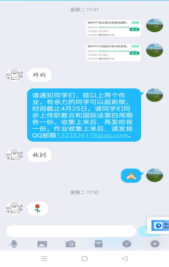在线上教学期间,我采用班干部负责制,充分发挥班干部的领头羊作用。在每班挑选1名责任心强的班干部,与我保持密切联系。通过与班干部及时沟通教学效果,保证教学有序进行。我要求班干部要及时跟进教学环节,做到每节课课前有序组织、课堂效果及时反馈、课后作业有效传达、提交。在班干部有力支持与配合下,确保了国际法线上教学质量的提升。