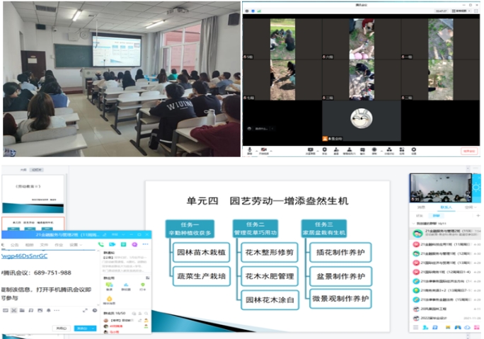 课堂教学传技能。课堂教学过程分教师讲授和学生操作两个部分,在教学过程的前期,由班长和学委组织学生在教室集合,教师通过腾讯会议直播讲授操作内容,并提出实践要求,学生领到实操任务后以小组为单位到校园中选择制作微景观的材料,进行设计与施工。在操作过程中,要求学生打开摄像头直播,师生就实操中的问题进行实时交流。下面三张图是教室上课和实操情况。