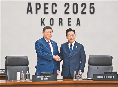 当地时间11月1日上午,国家主席习近平出席亚太经合组织第三十二次领导人非正式会议东道主交接环节,宣布中方将于明年11月在广东省深圳市举办亚太经合组织第三十三次领导人非正式会议。这是习近平同韩国总统李在明在交接环节上握手。