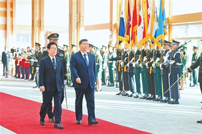 习近平同李在明登上检阅台。军乐团奏中韩两国国歌。习近平在李在明陪同下检阅仪仗队。两国元首分别同对方陪同人员握手致意。