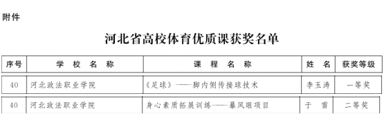 近日,河北省教育厅公布了2025年河北省高校体育优质课评选结果,我校体育教学部李玉涛老师的《足球——脚内侧传接球》课程荣获一等奖,于雷老师的《身心素质拓展——暴风眼》课程荣获二等奖。